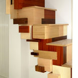 Una scala che sale e scende su se stessa. Il soggiorno era arredato con oggetti particolari e stampe d'arte, strumenti musicali, anche una semplice scala avrebbe dovuto essere un oggetto unico. Per rendere una presenza discreta, ho optato per il modulo parallelepipedo, immaginandolo come una via Lattea che tagliasse diagonale la parete.